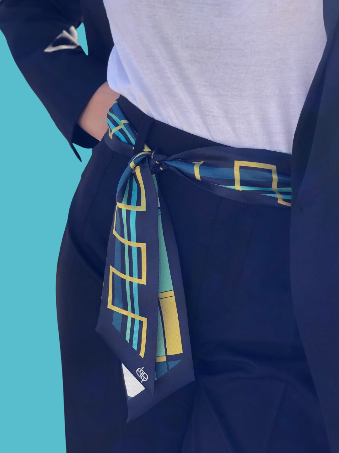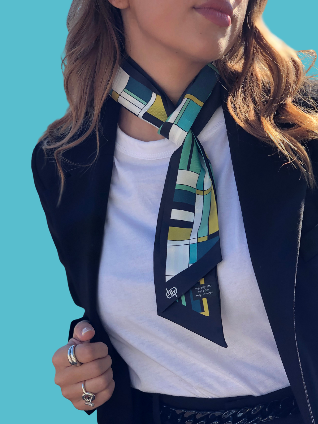 "Un jeu de contraste et de dualité, comme un dialogue entre deux époques de la soie. Envers est réversible, résolument moderne, et pensé pour accompagner toutes vos expressions de style. J'aime l'envers autant que l'endroit, et je trouve très intéressant de jouer avec ses deux faces au nouage, en faisant ressortir des parties des 2 imprimés. I se marie à merveille avec le bleu marine, mais évidemment aussi avec les verts, les kakis et le jaune moutarde. On me dit souvent que c'est un foulard de blonde. Il est vrai qu'il leur va très bien. Mais à moi aussi ! " Valérie, Créatrice de Divine Trouvaille.