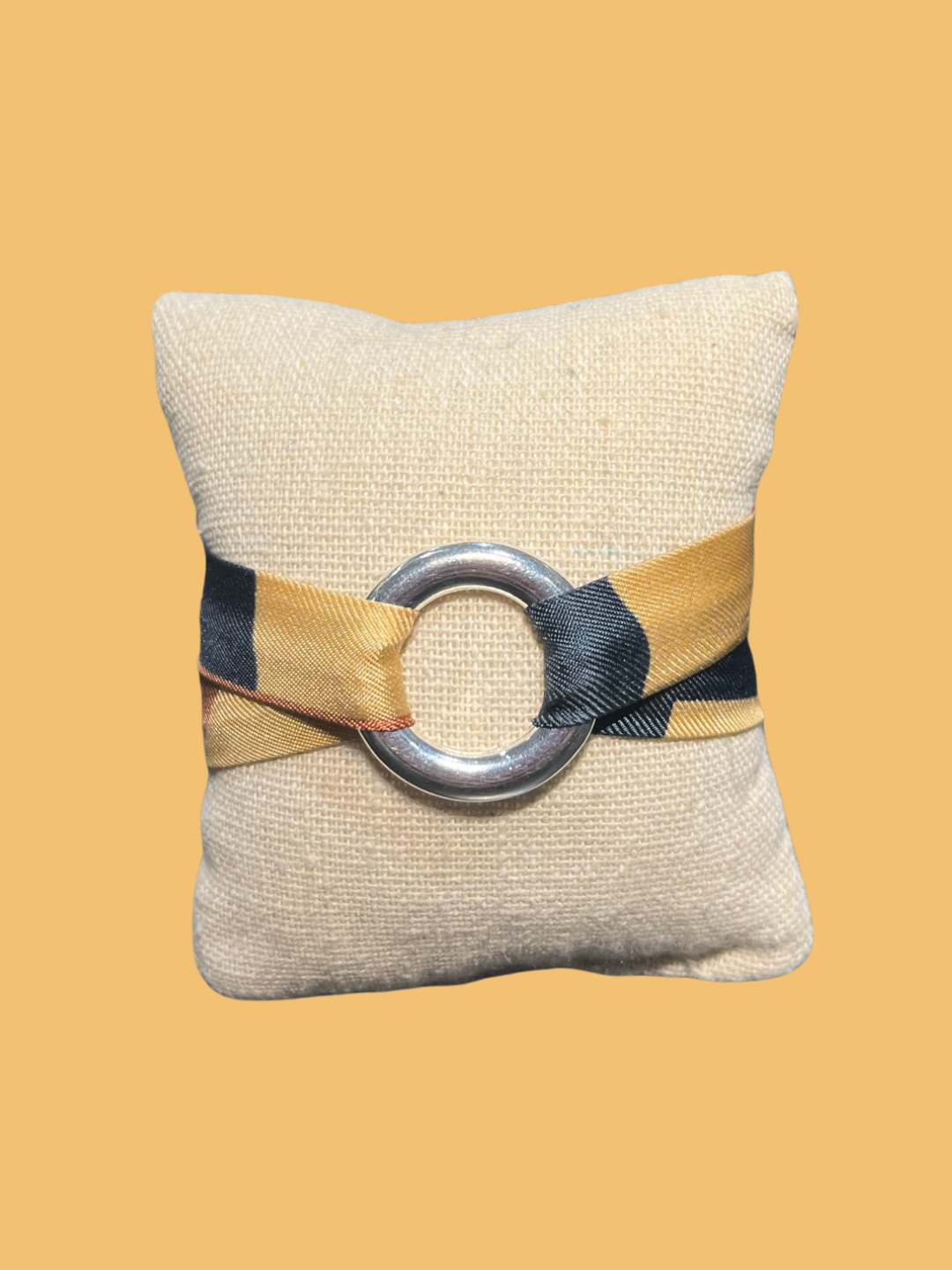 • Ruban en twill de soie, décliné d’un de nos bandeaux foulards. Embouts en plaqué argent.