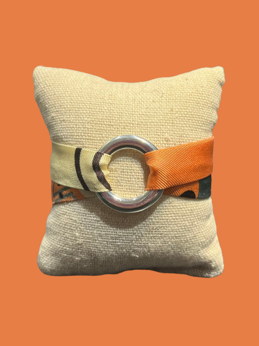 • Ruban en twill de soie, décliné d’un de nos bandeaux foulards. Embouts en plaqué argent.