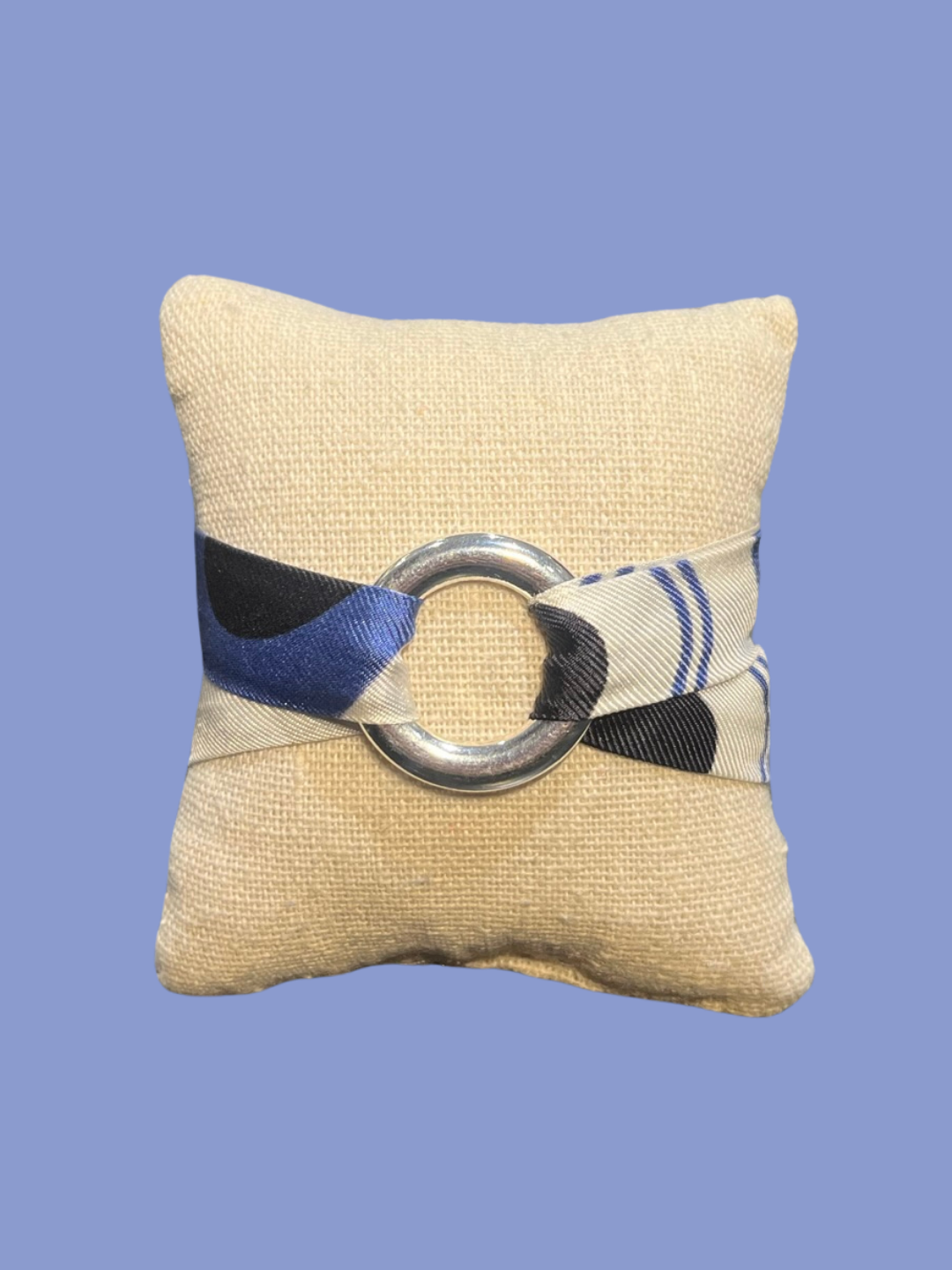 • Ruban en twill de soie, décliné d’un de nos bandeaux foulards. Embouts en plaqué argent.