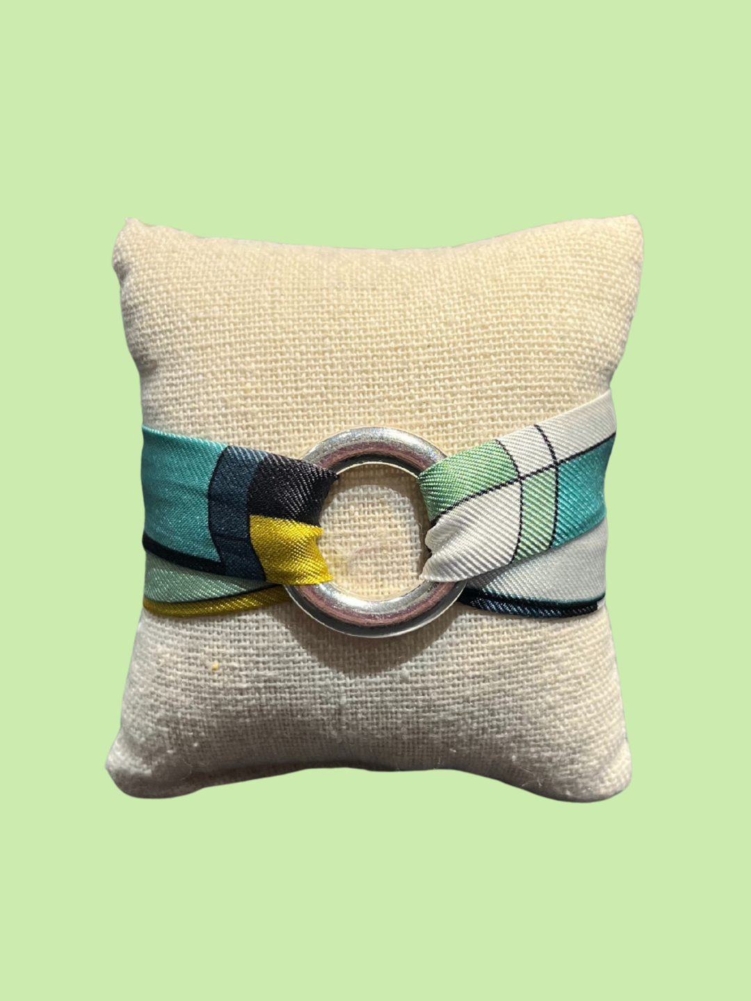 • Ruban en twill de soie, décliné d’un de nos bandeaux foulards. Embouts en plaqué argent.