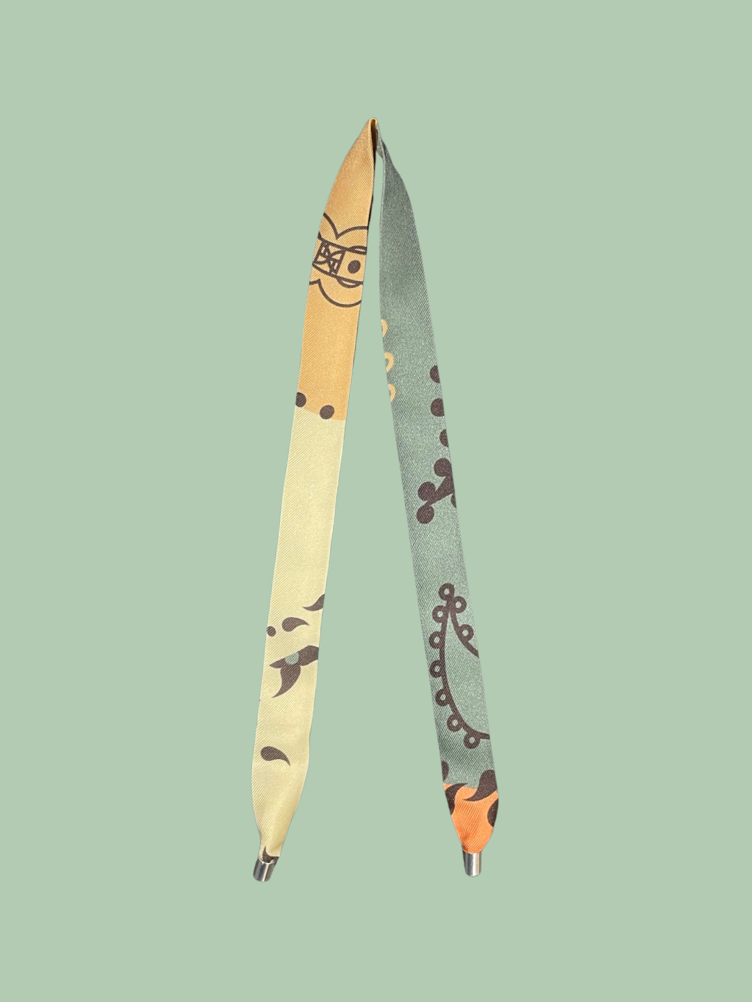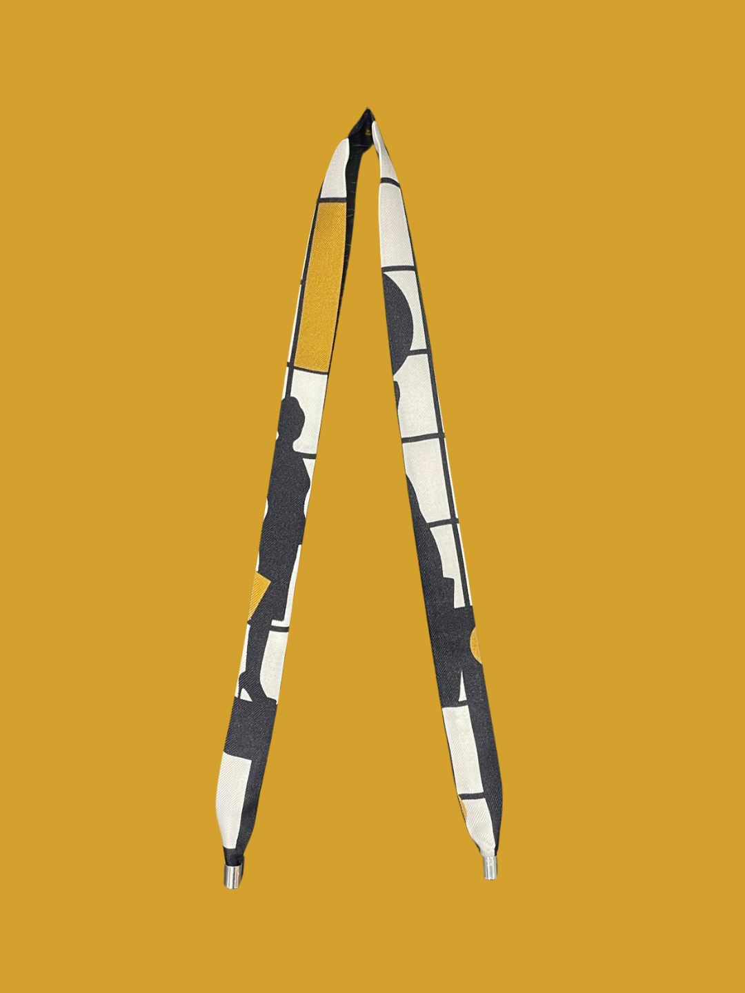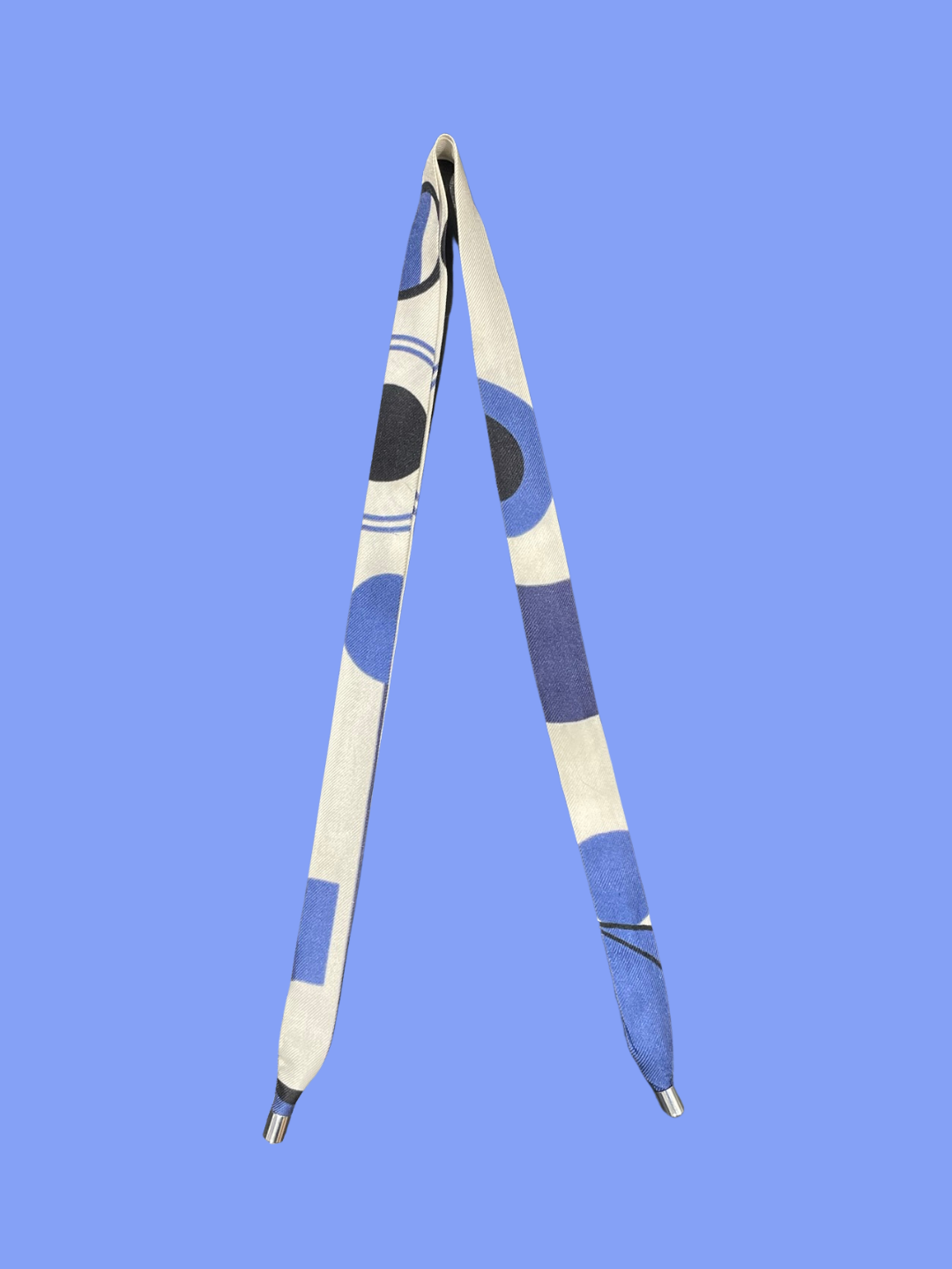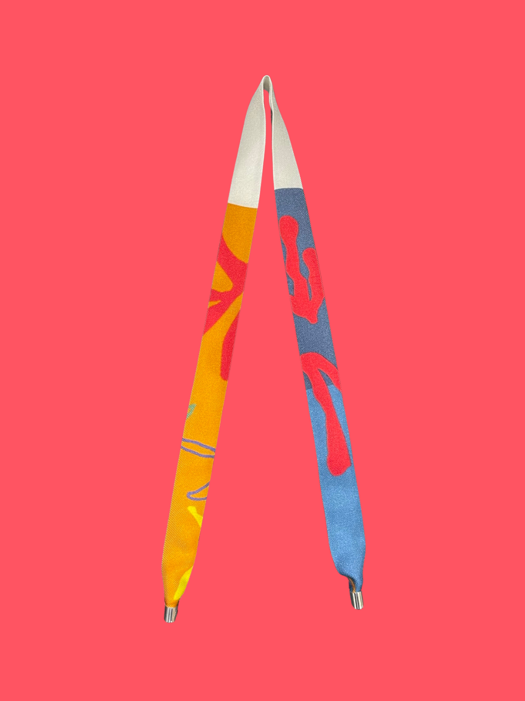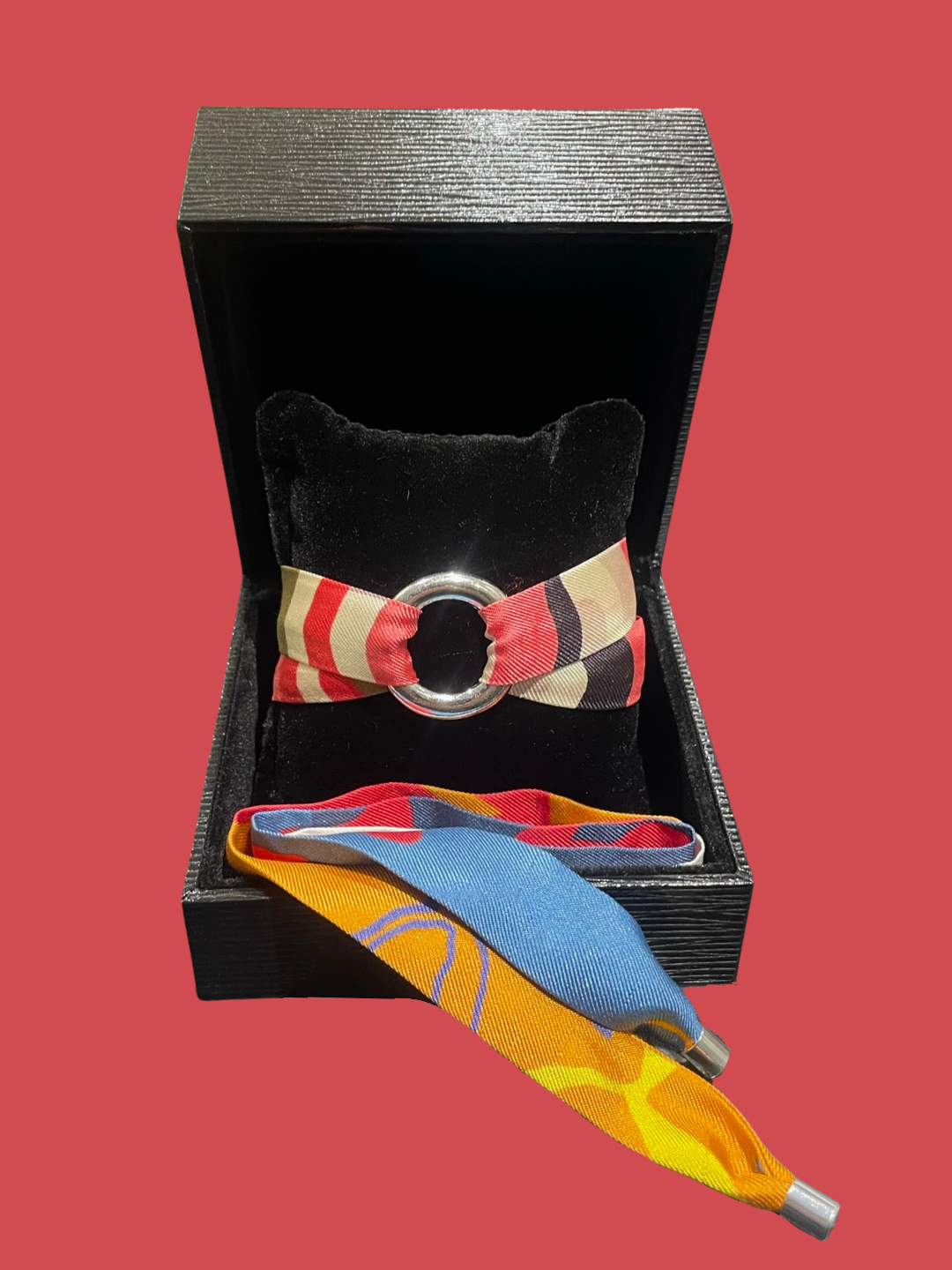 • Ruban en twill de soie, décliné d’un de nos bandeaux foulards. Embouts en plaqué argent.