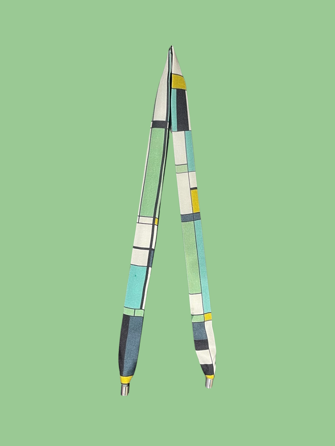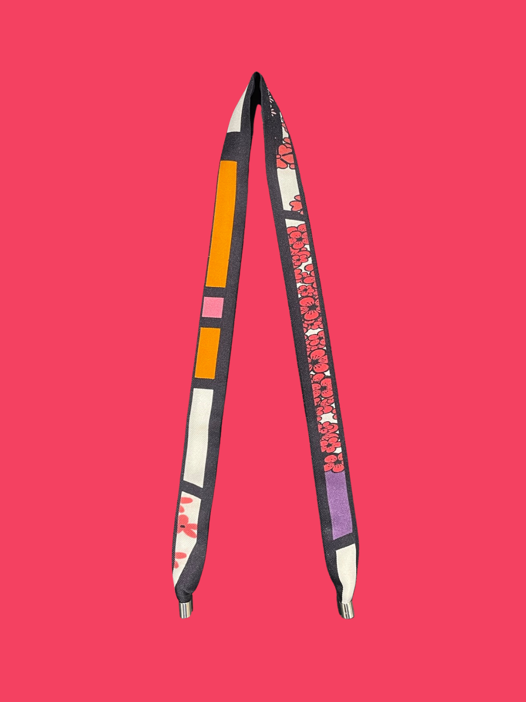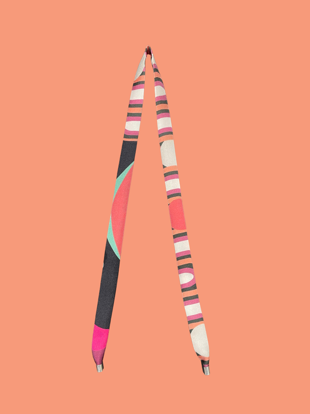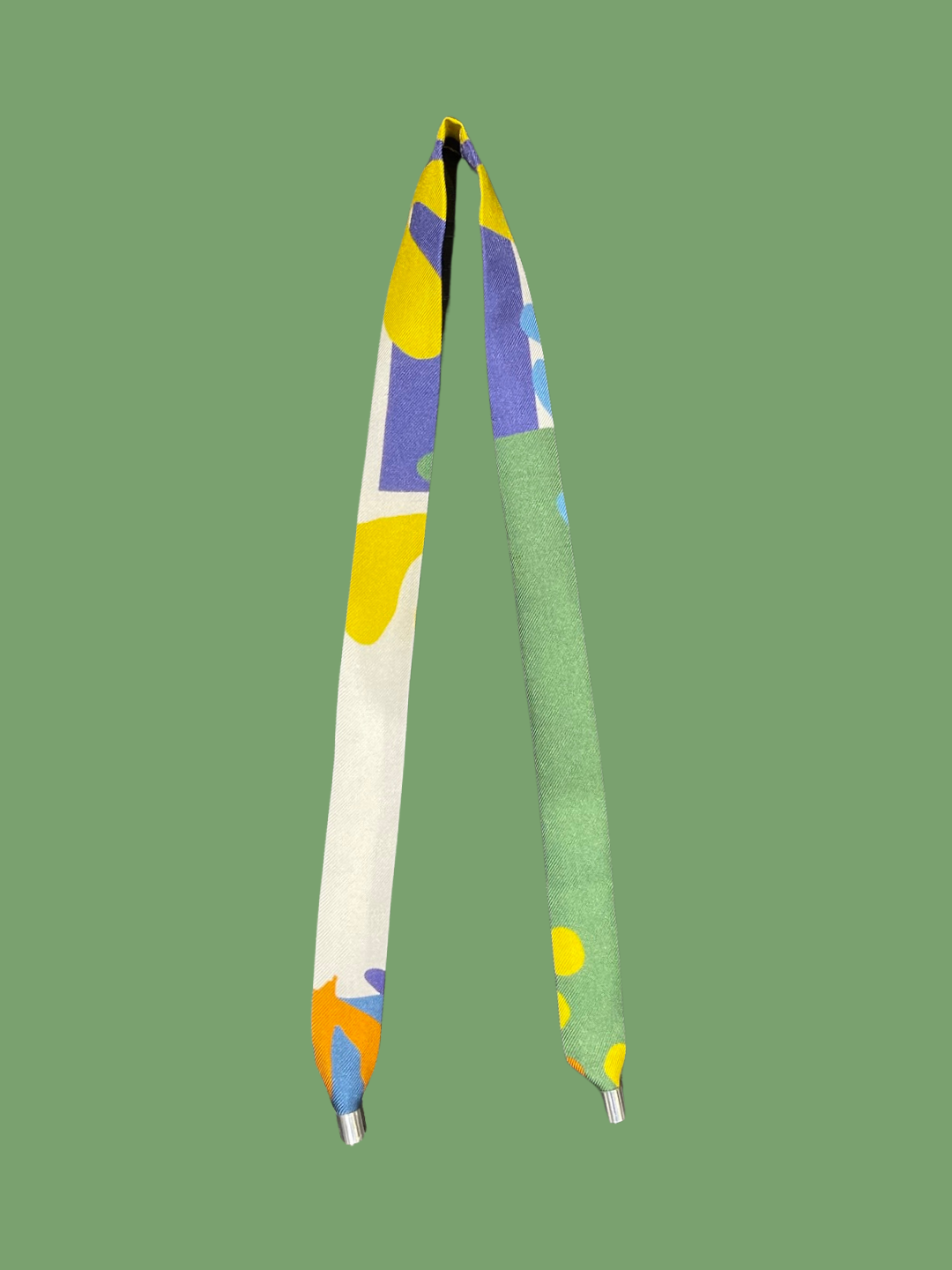 • Ruban en twill de soie, décliné d’un de nos bandeaux foulards. Embouts en plaqué argent.