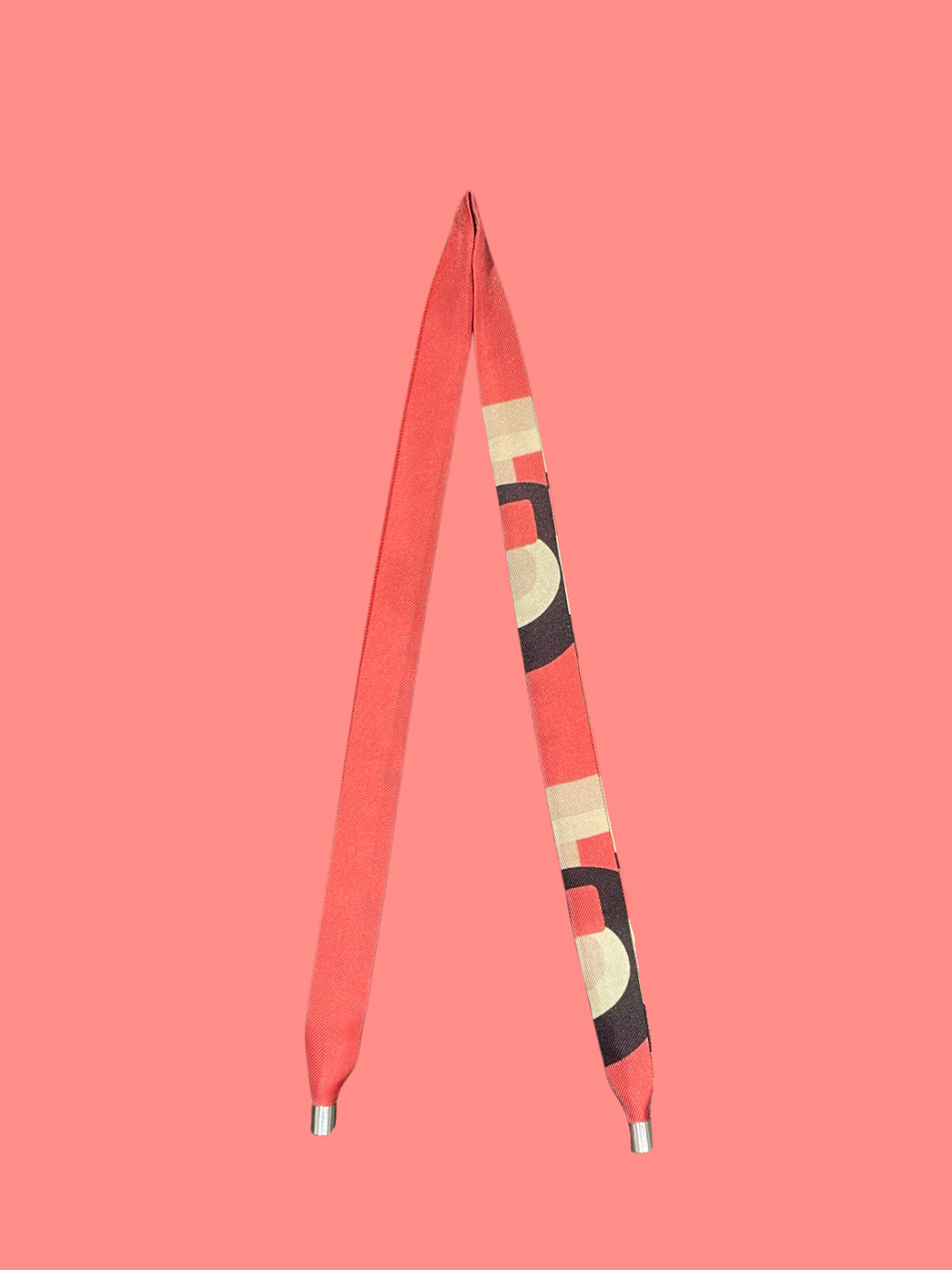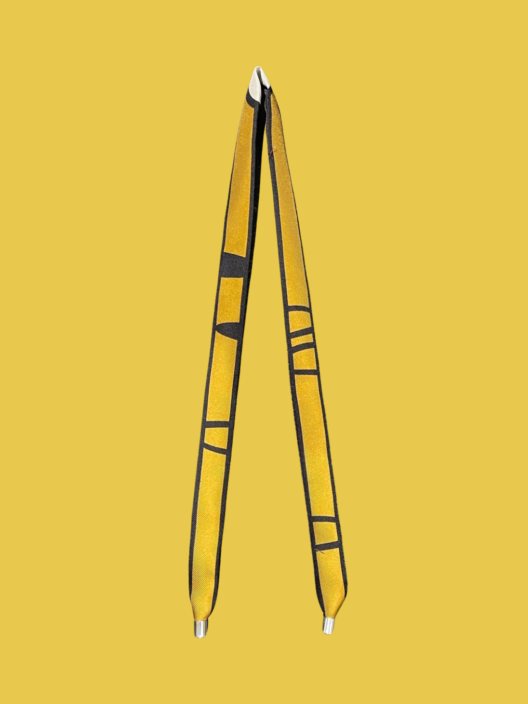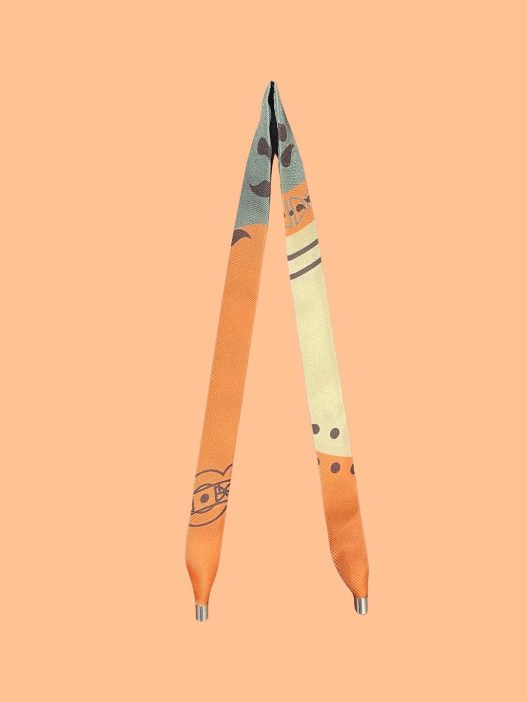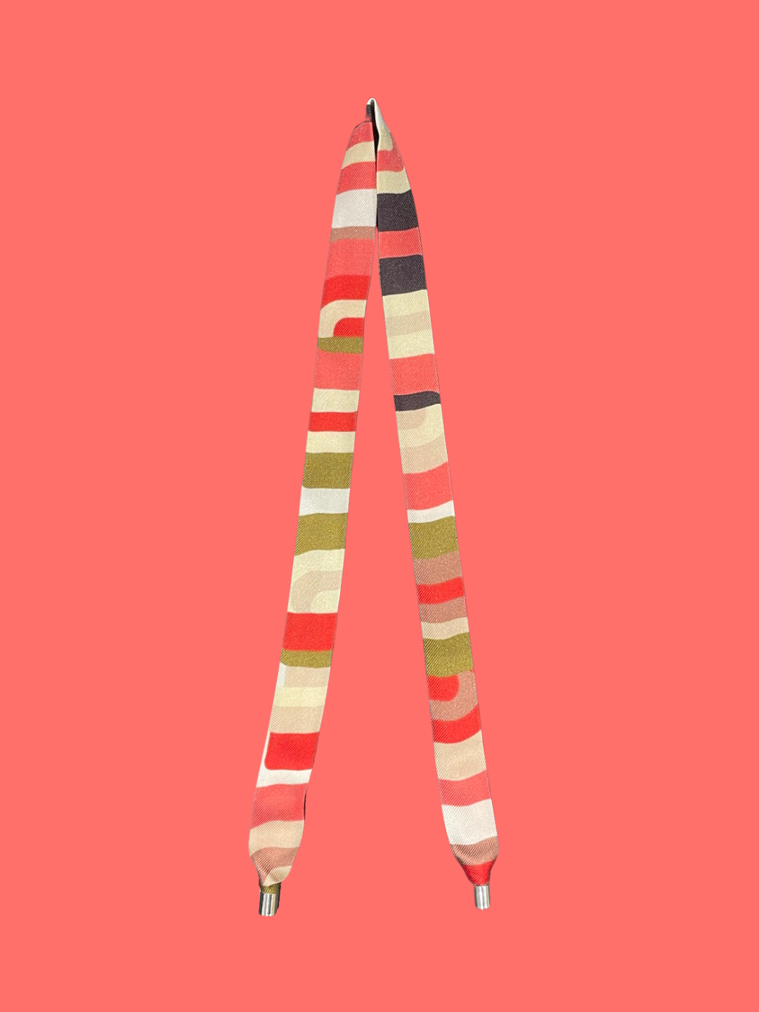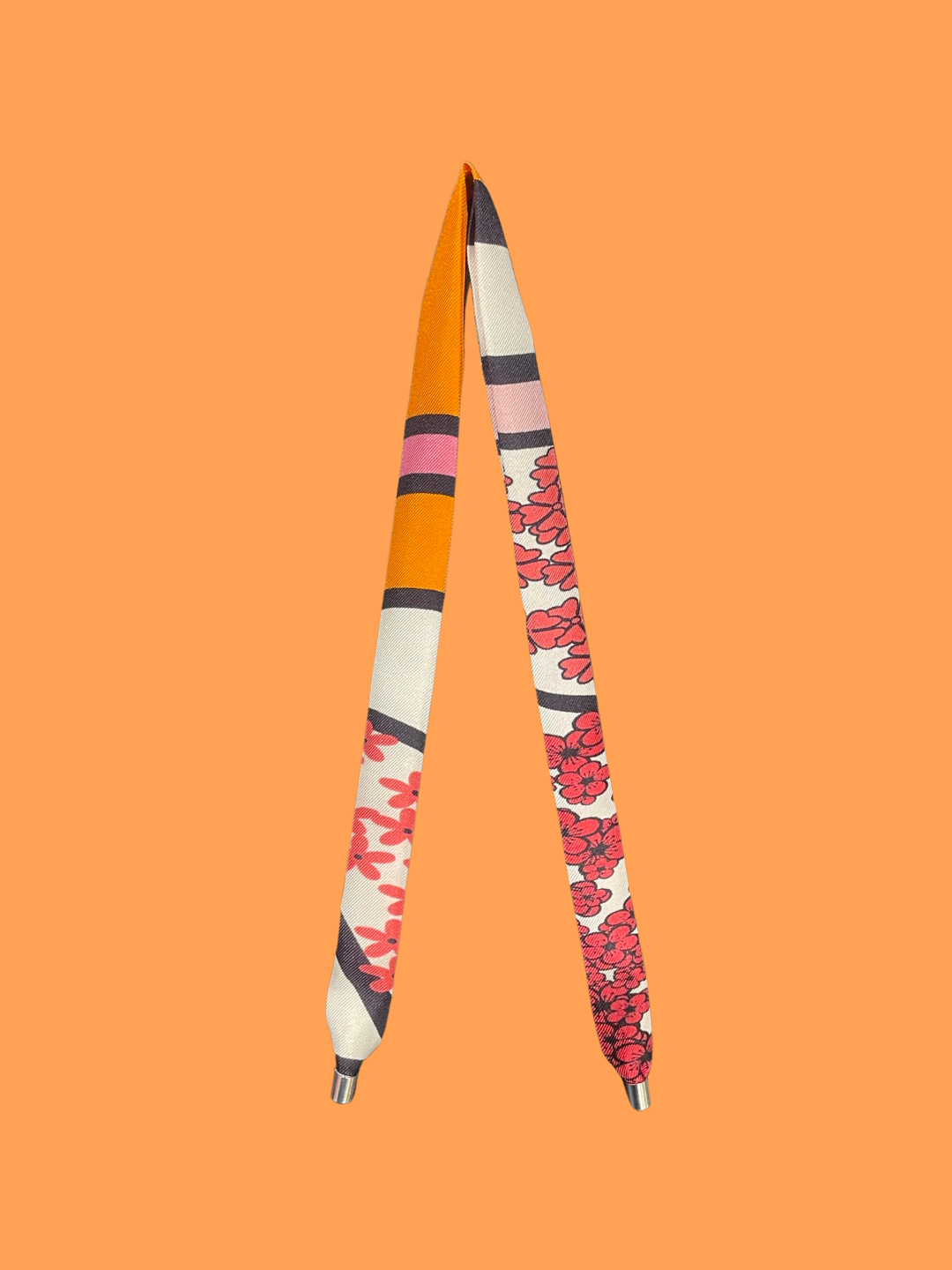 • Ruban en twill de soie, décliné d’un de nos bandeaux foulards. Embouts en plaqué argent.