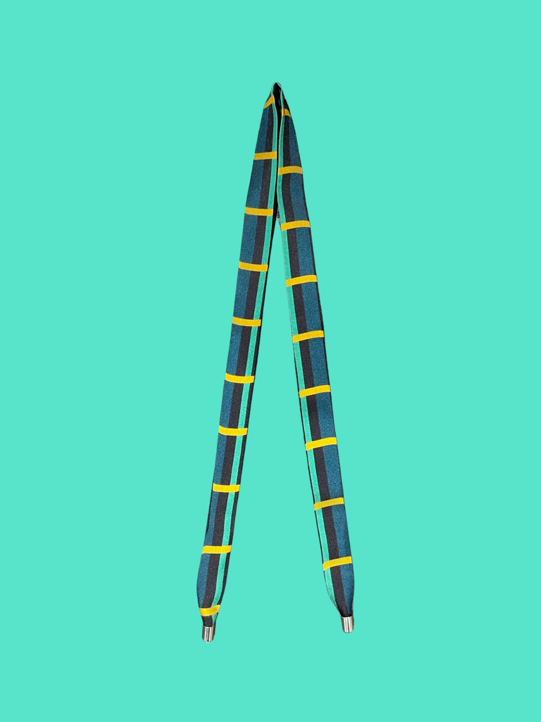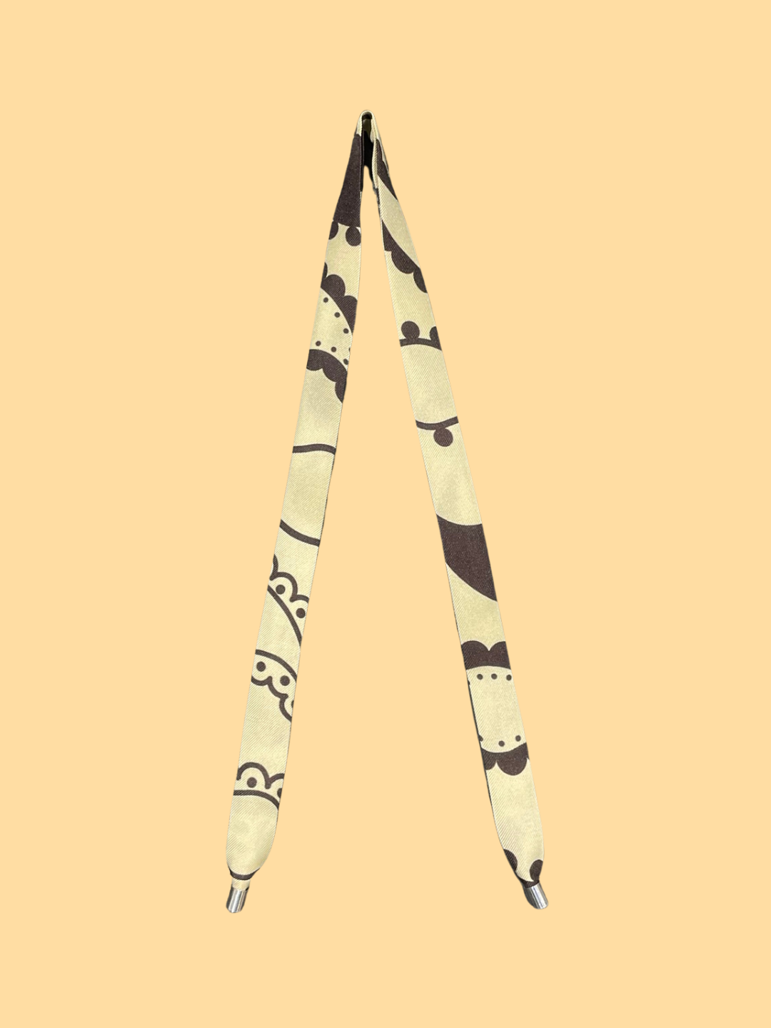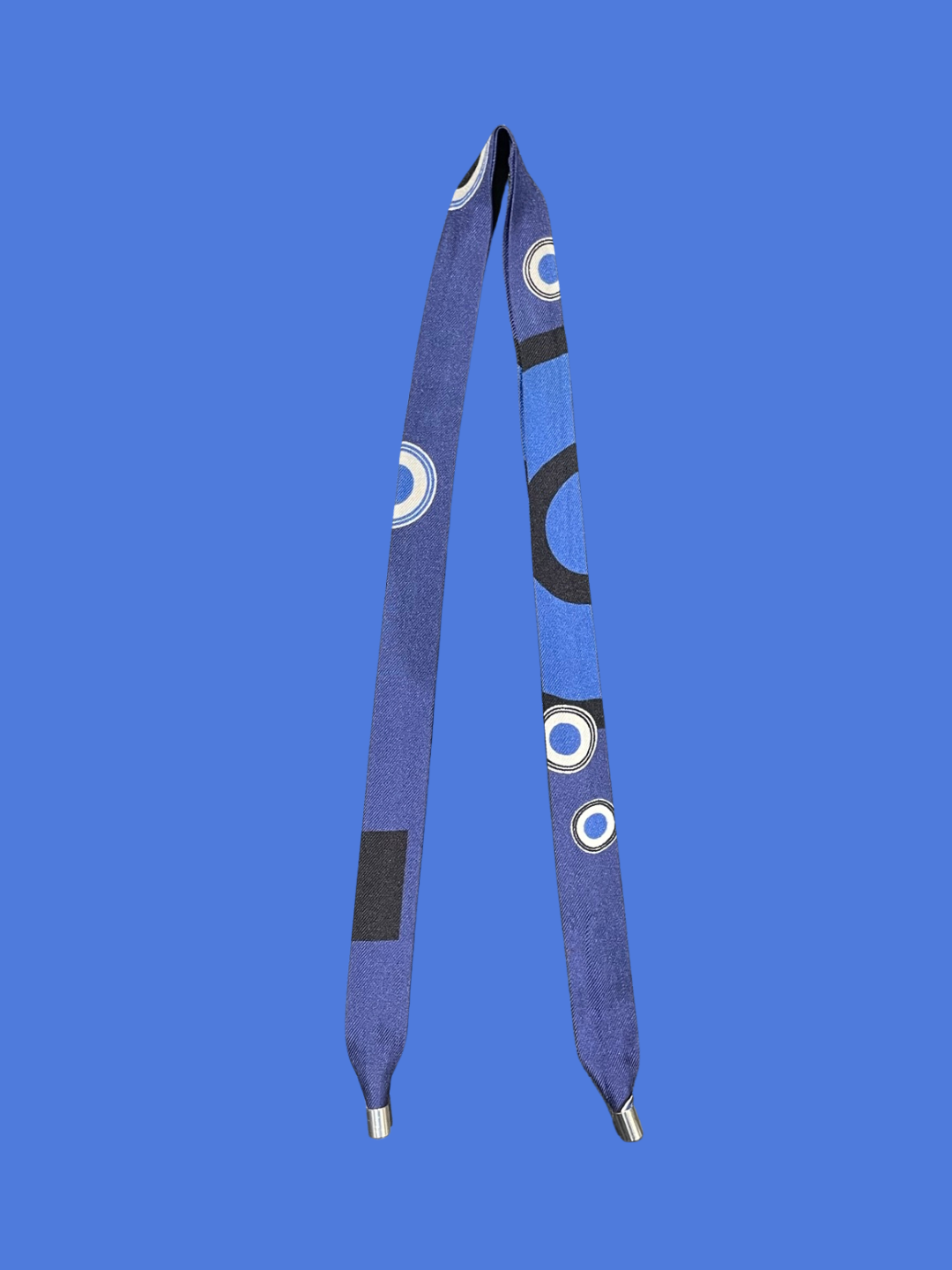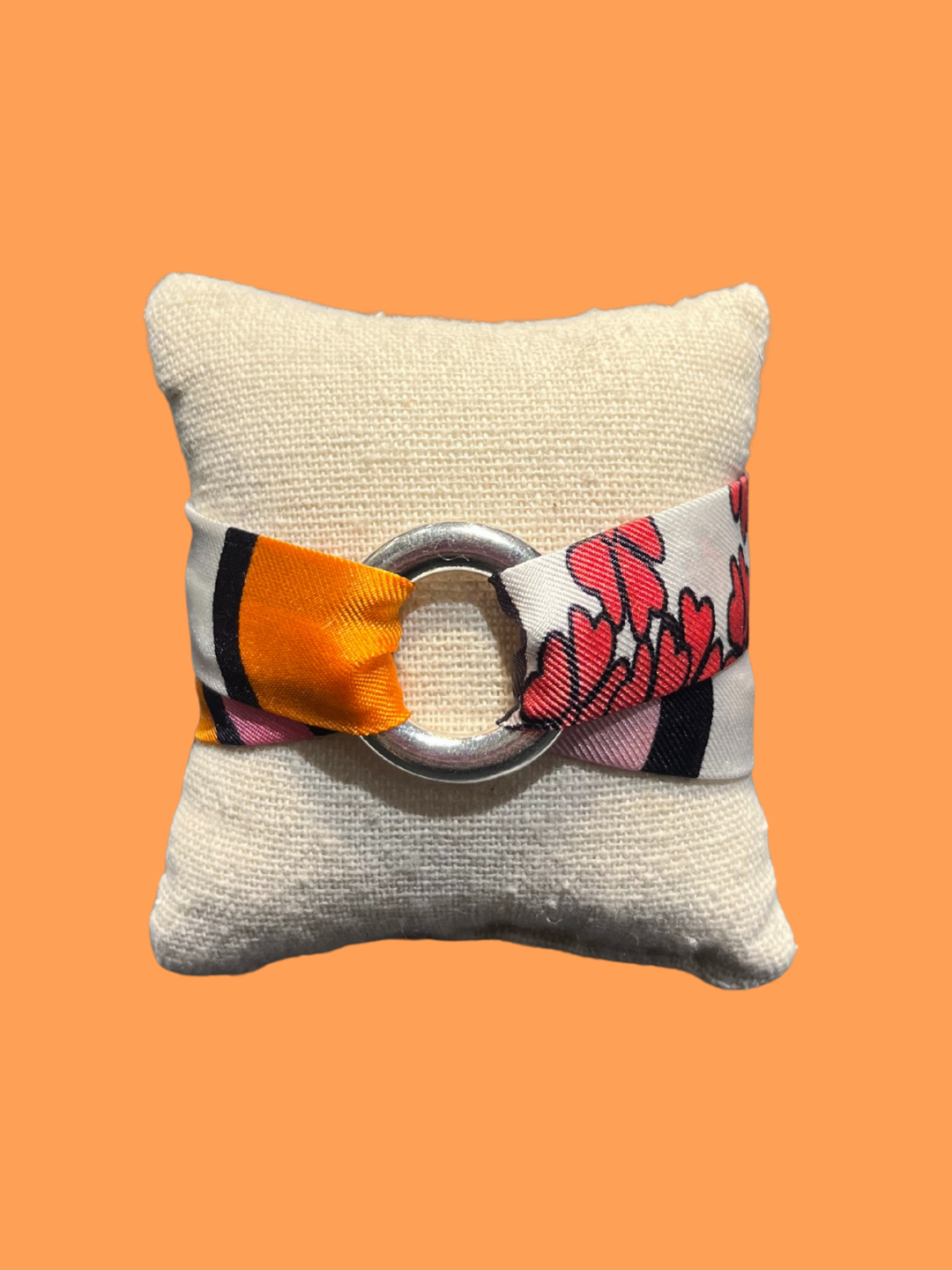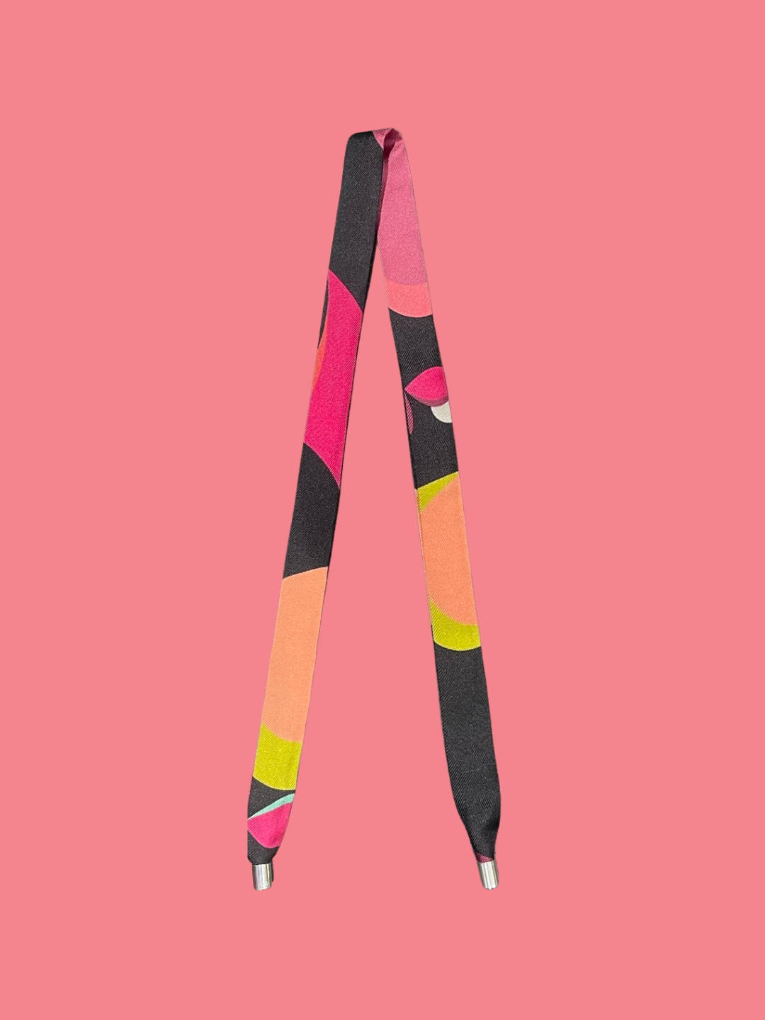• Ruban en twill de soie, décliné d’un de nos bandeaux foulards. Embouts en plaqué argent.