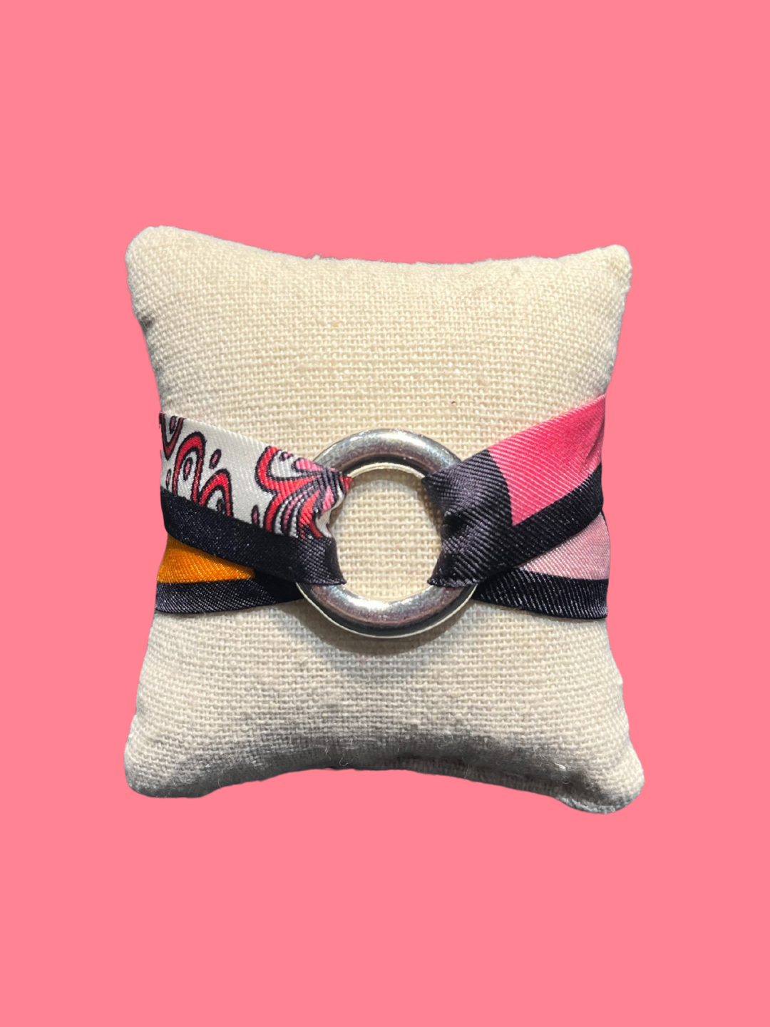 • Ruban en twill de soie, décliné d’un de nos bandeaux foulards. Embouts en plaqué argent.