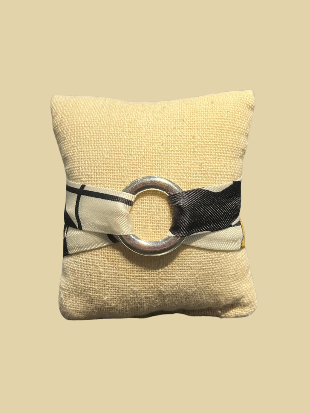 • Ruban en twill de soie, décliné d’un de nos bandeaux foulards. Embouts en plaqué argent.