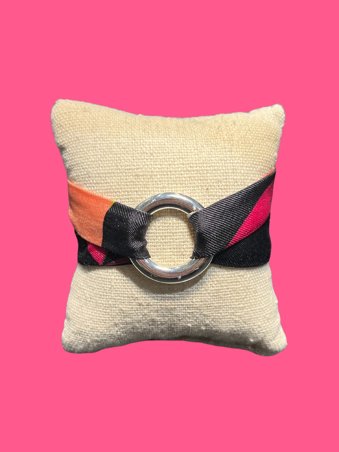 • Ruban en twill de soie, décliné d’un de nos bandeaux foulards. Embouts en plaqué argent.