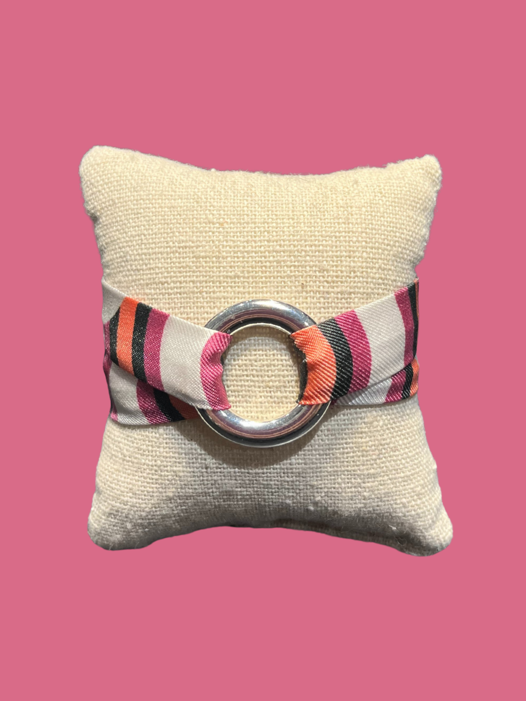• Ruban en twill de soie, décliné d’un de nos bandeaux foulards. Embouts en plaqué argent.