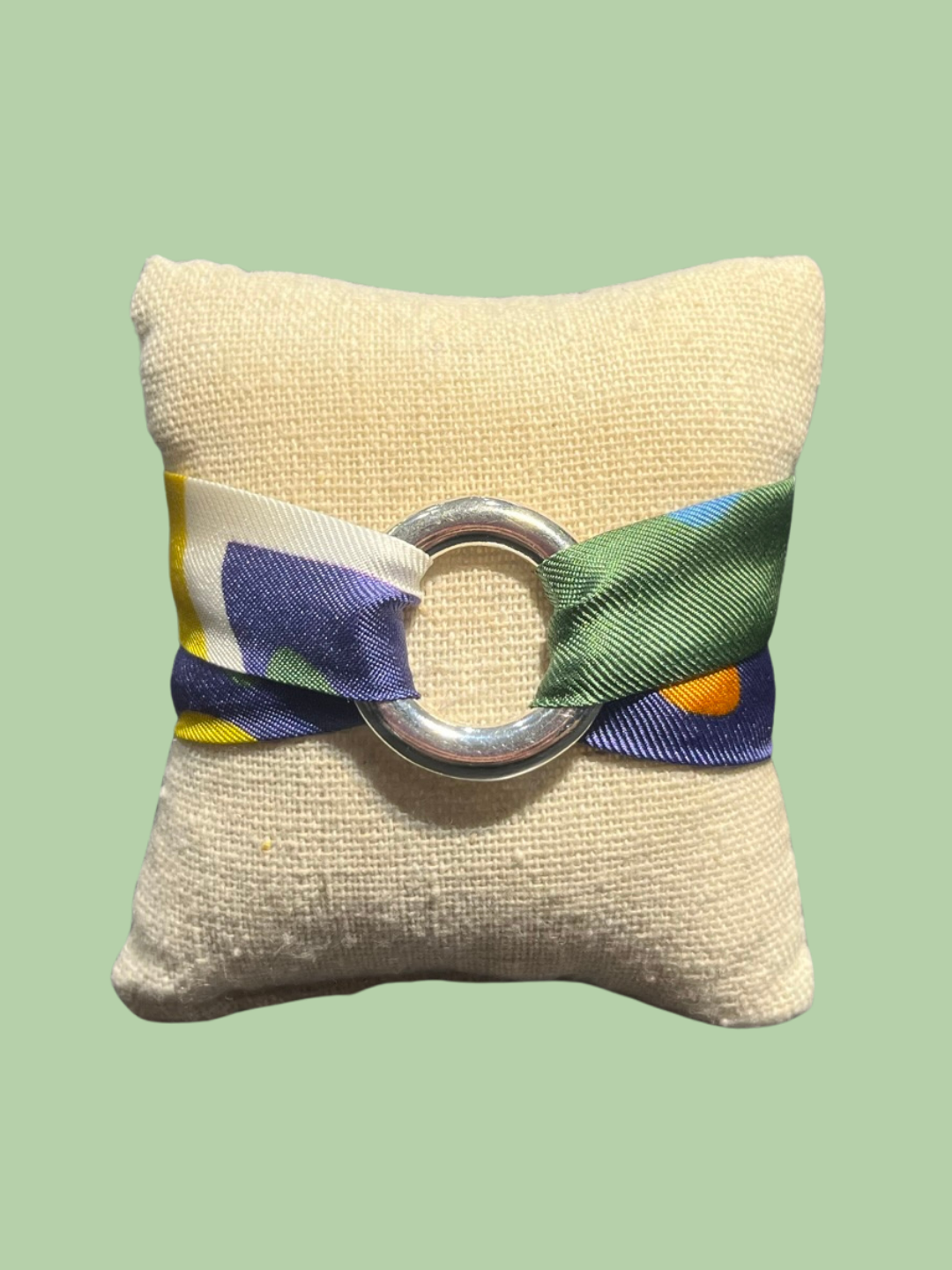 - Ruban en twill de soie, décliné d’un de nos bandeaux foulards. Embouts en plaqué argent.